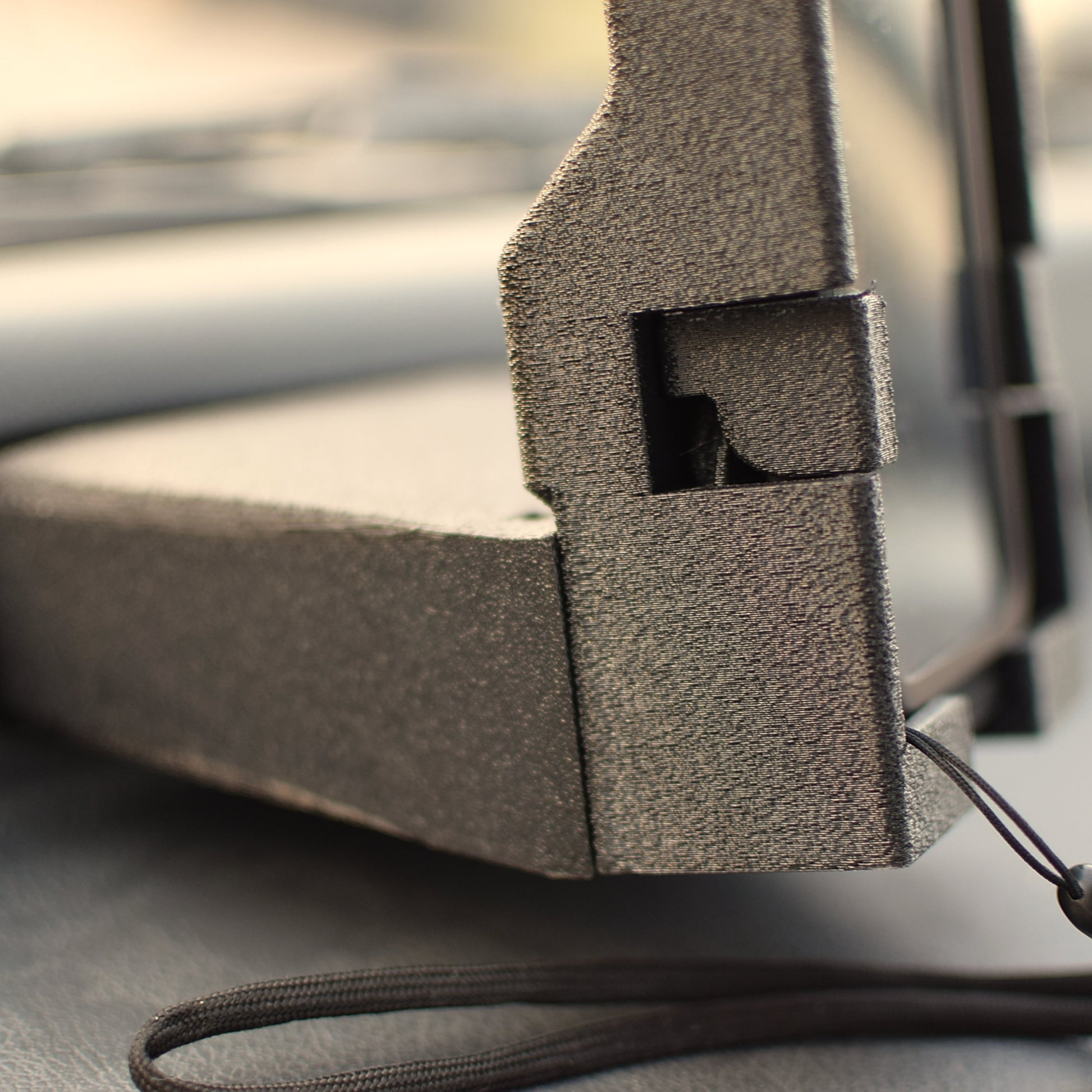 Made out of black ABS plastic and Steel hardware. It's the same material used on automotive interiors. It's capable of holding up to the sun and heat.